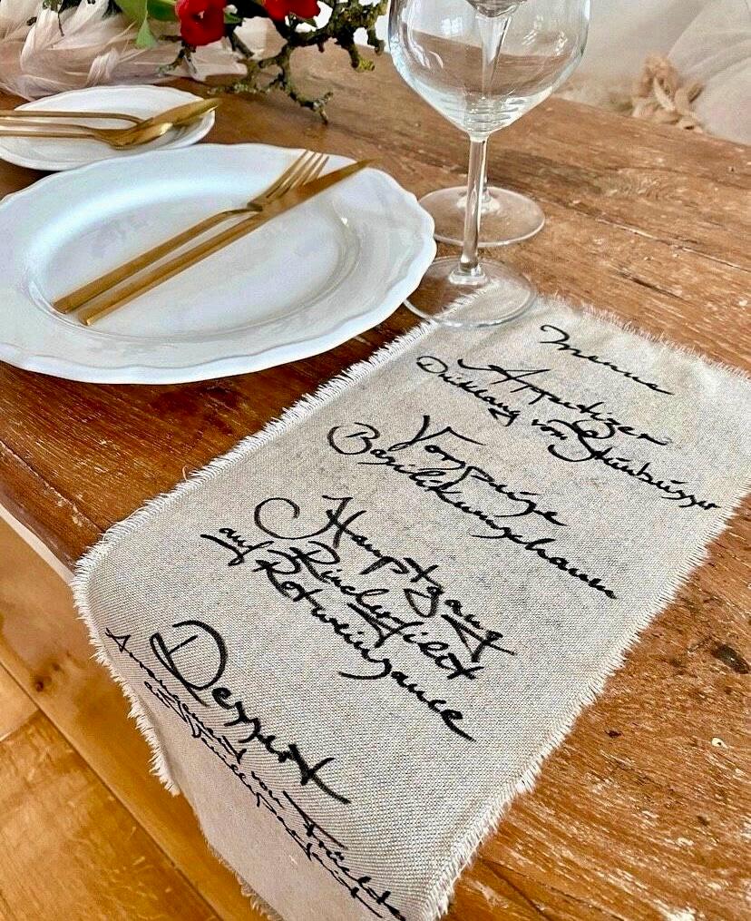 Mit Feder, Tinte, Stoff und Papier entstehen individuelle Einladungen, Menükarten, Gelübde sowie textile Details wie Banner, Traubögen oder Tischläufer – emotional, zeitlos und mit viel Liebe zum Detail.