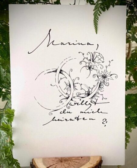 Ein besonderes Highlight ist ihre Live-Kalligraphie: Schriftzüge auf Tischdecken, Schleifen, Kleidern oder Hemden werden direkt vor Ort zu einzigartigen Erinnerungsstücken, die bleiben.