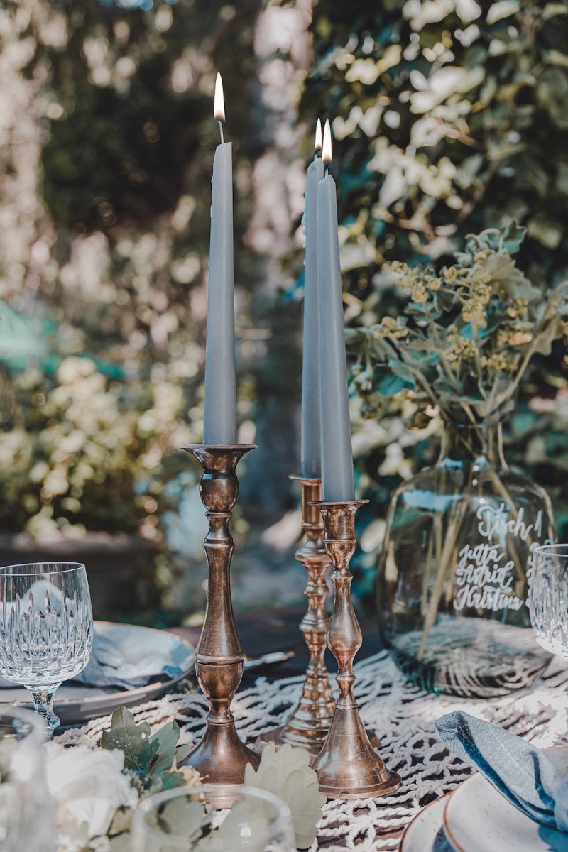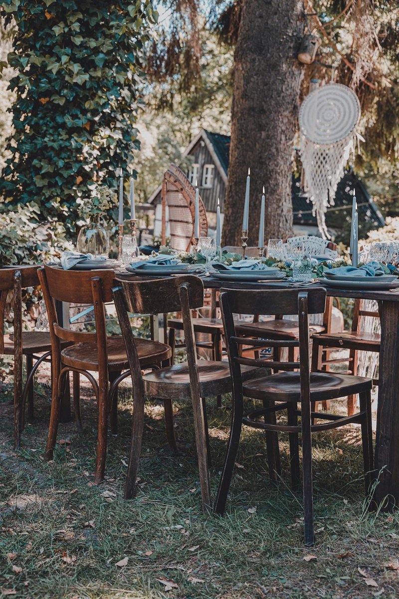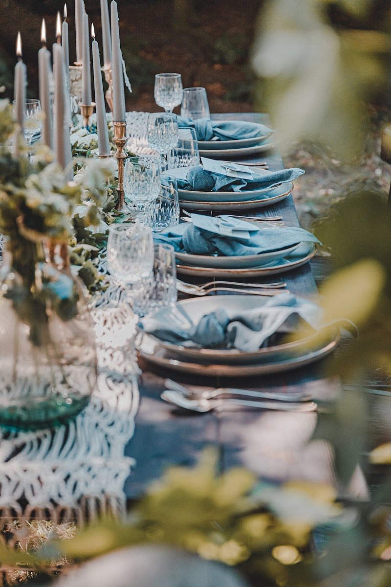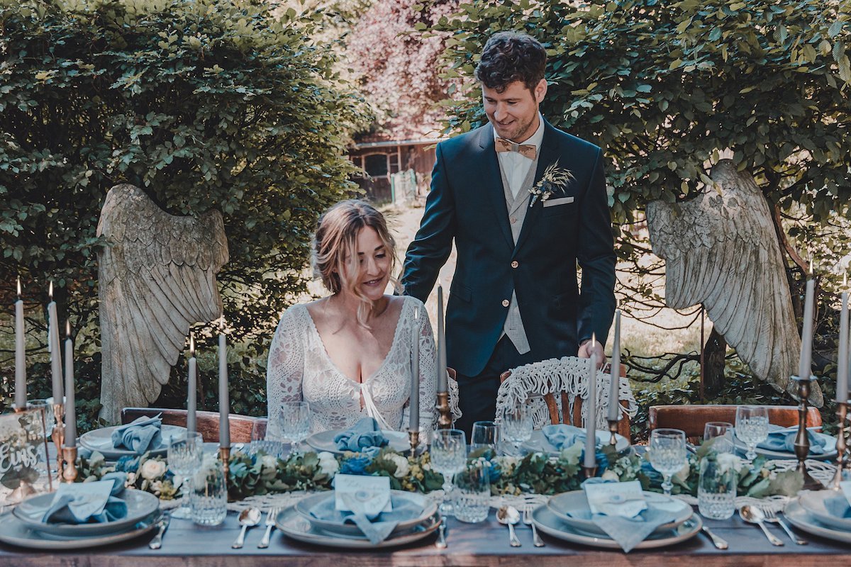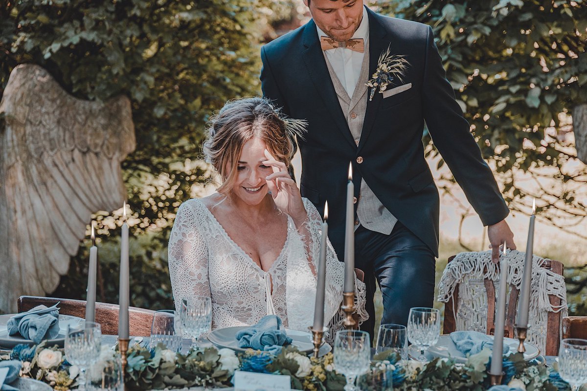 Die sanften, warmen Farben des heimischen Gartens standen bei dem Farbkonzept dieser Green Wedding Pate. Bewusst hat sich das Team dazu entschieden, ausschließlich heimische Blumen, die gerade Saison hatten, mit einfließen zu lassen und die restliche Deko wie die Hochzeitstafel oder Boho Lounge in die natürliche Umgebung der Paasmühle einzubinden. Für akzentuierte Highlights sorgt hier der Farbton Gold, der von einem edlen Blau getragen wird. Ein Konzept, welches ich so noch nicht oft gesehen habe und das von der Hochzeitsfotografin Kathrin Heumann in sehr eindrücklichen Bildern festgehalten wurde.